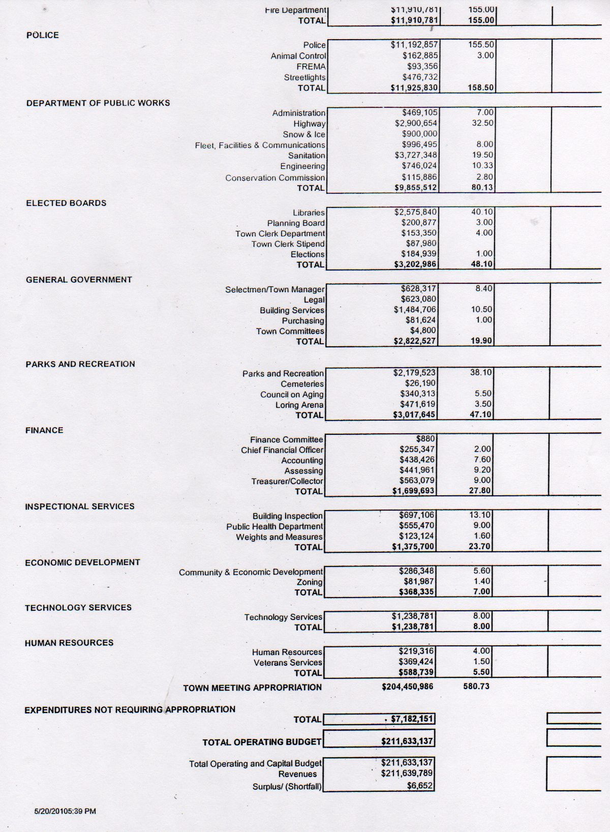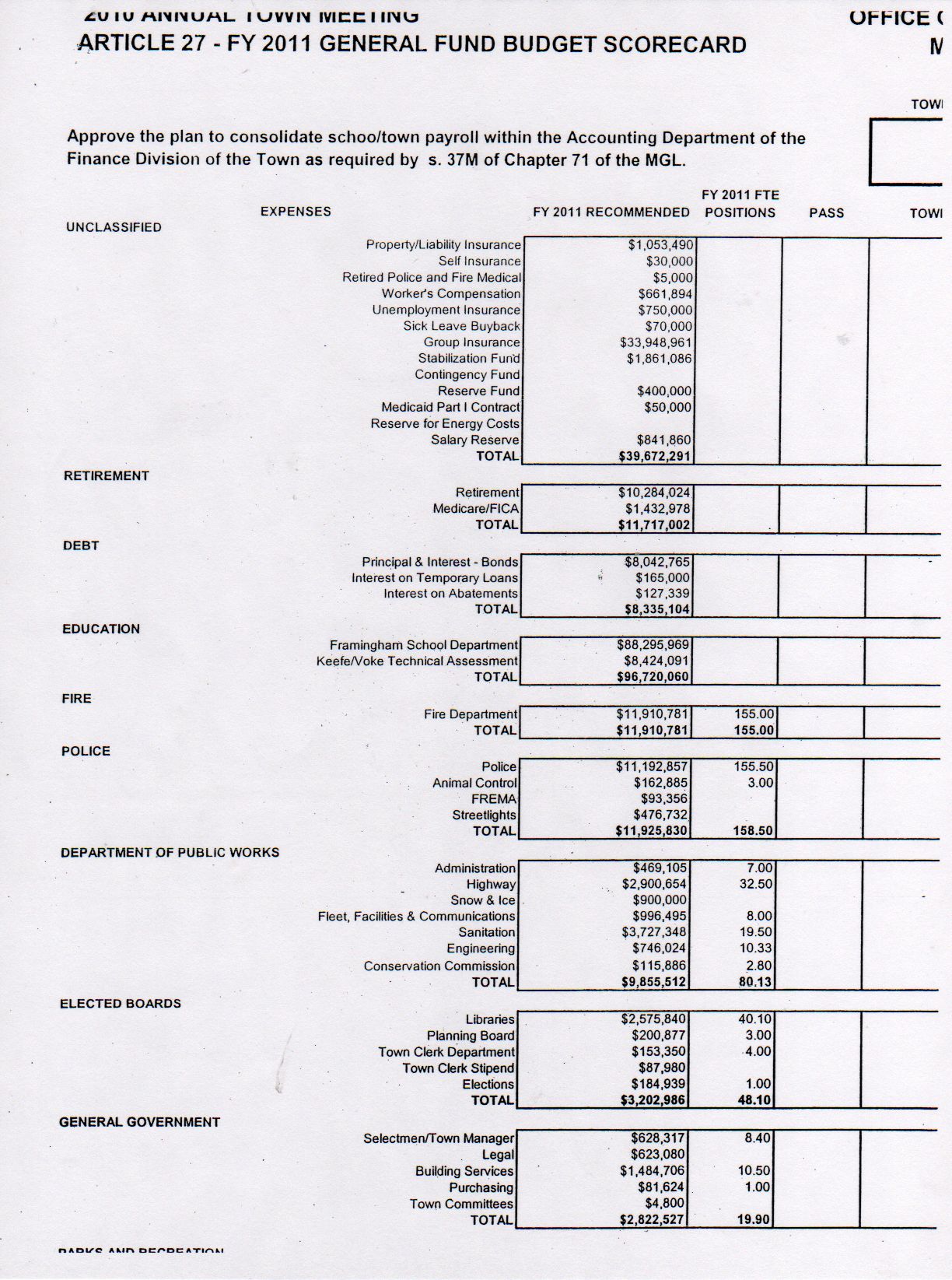 These two pages represent the 2011 town budget and show the Full Time Equivalents (FTEs), 580.
