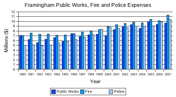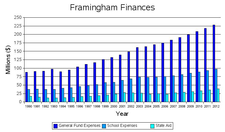 In 1996, in it's 296th year of operation, the Town of Framingham reached a milestone when it's General Fund went over $100 million. Eleven years later, the General Fund stands at $183 million. Using dubious accounting practices, the Town of Framingham continues to deliberately obfuscate the amount of money being spent on schools The sharp drop in 1994 was caused when the Enterprise Fund was split from the General Fund. |