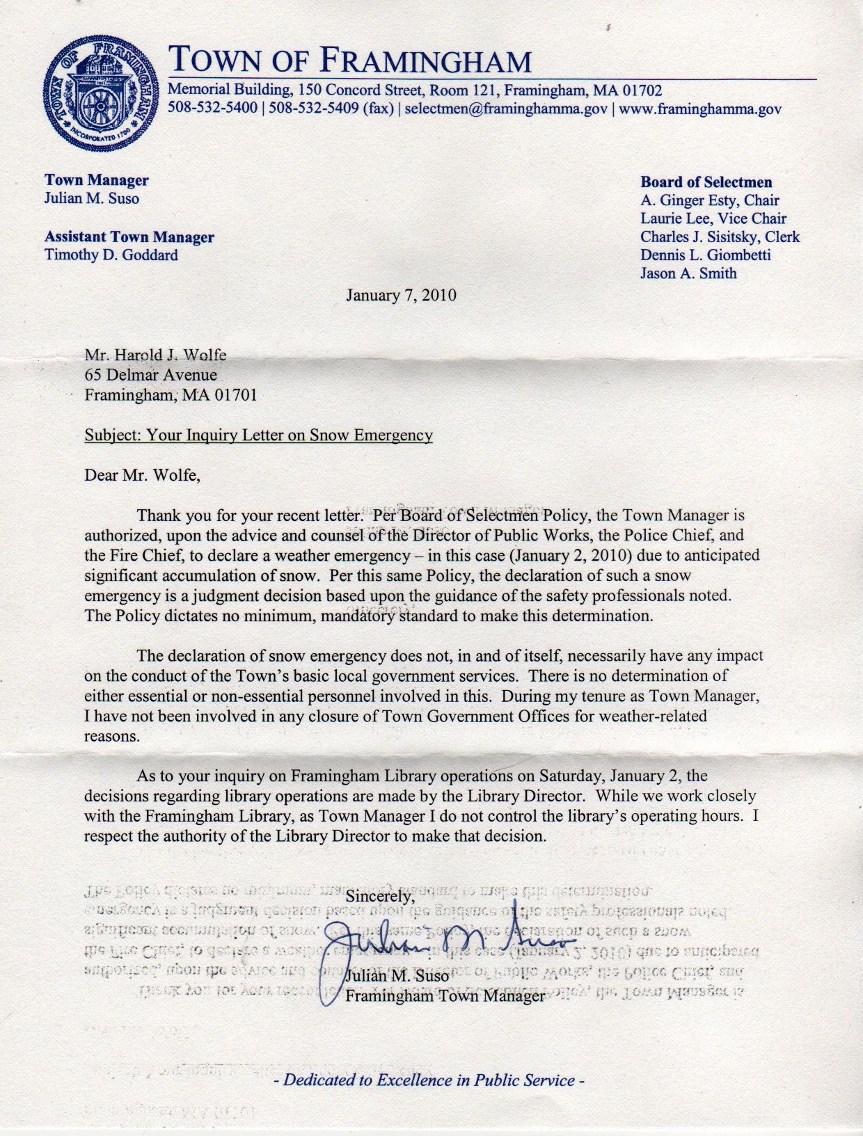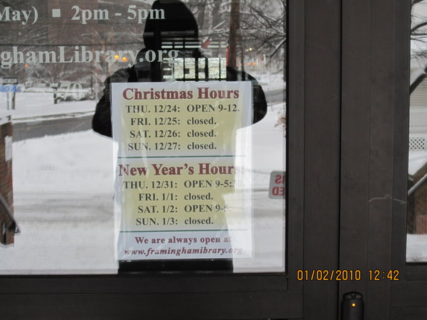 All retail operations were open for business and even the U.S. Post Office was open. The only public sector unit that was closed (but supposed to be open) was the Framingham library. No attempt was made to communicate with the public about closing the library. The library director could have posted something on the web site but he does not seem to understand the concept of web sites. He could have also posted a mail message on the frambors, but why would he want to be friendly to the community of taxpayers. If the Framingham library staff of 40 were paid for the day off, I find it amusing that I am a retired software engineer who gets paid nothing to examine the town's bloated bureaucracy wanted to work but was unable to because the Framingham library staff of 40 and a well paid library director Mark Contois were not motivated to work. What seems interesting here is that the library officials are telling us in no uncertain terms that they are non-essential personnel. This is very useful information to have, knowing that Framingham will face a significant Reduction In Force (RIF) come spring time as the town faces a $10-$20 million deficit mostly due to a bloated bureaucracy. The Framingham library is becoming notoriously unreliable as a public institution. Now, I'll have to call before any snow storm.