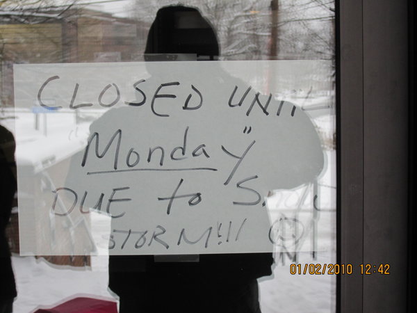 According to our town manager, there is no minimum standard and no written guidelines on declaring a snow emergency. In this case, the library was closed on the instructions of the library director Mark Contois. I talked to Mark Contois in his office on January 5, 2010 and he did tell me that the library employees were paid for the day off. He told me that he would send me some response, but he has not responded to date (January 19, 2009). The library has 40 employees and expends $2.5 million per year. I will assume that 25% of employees are part time and did not get paid. The library's hours are 9-9 Monday thru Friday, and 9-5 on Friday and Saturday (aproximately 20,400 hours per year). This makes the hourly cost of library operation close to $123. Given that January 2, 2010 was a Saturday, an 8 hour work day, the cost of closing the library was