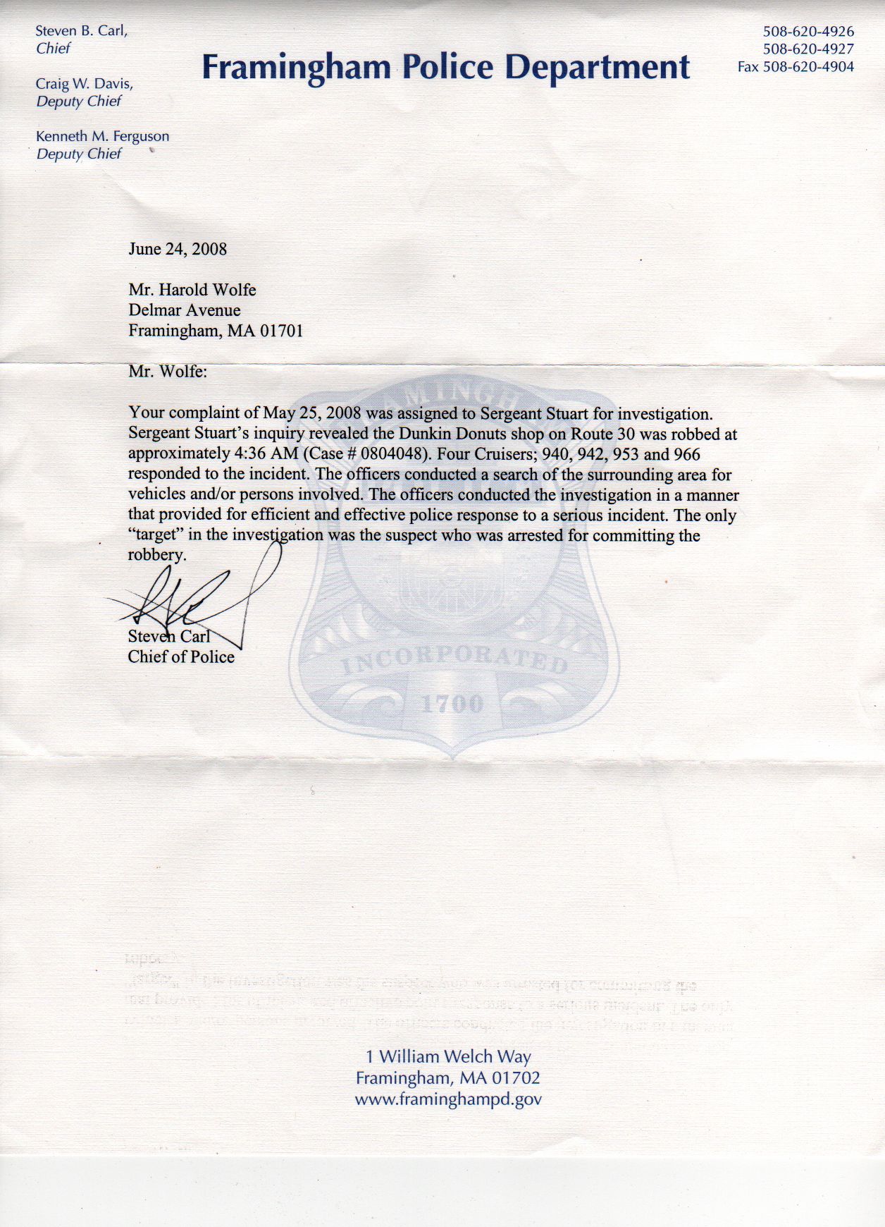 I have been informed by Steven Carl, the police chief of Framingham