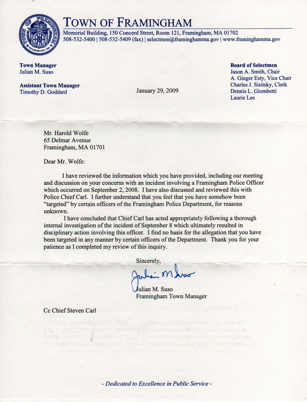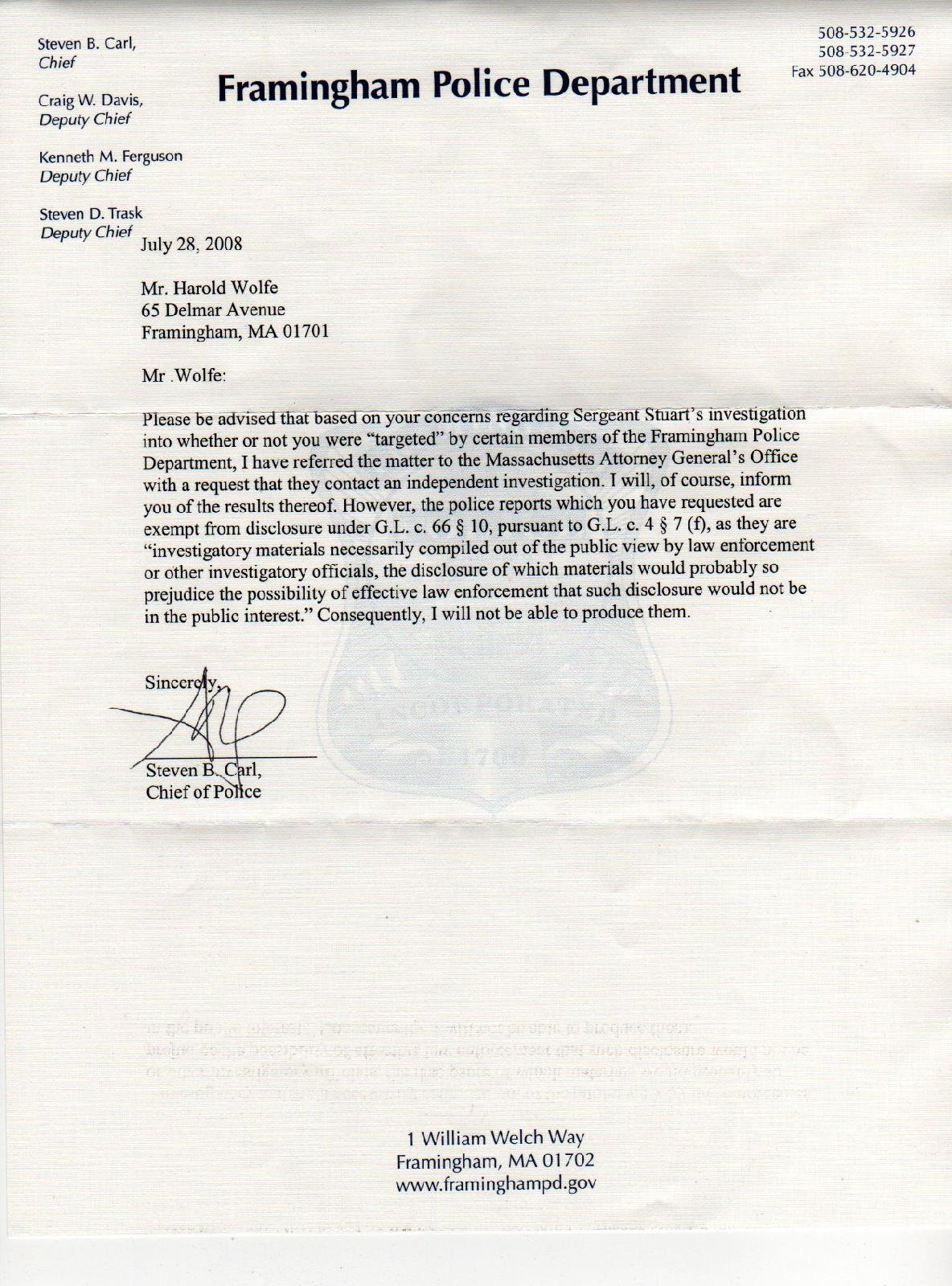 exchanges with Framingham's chief of police and town manager.