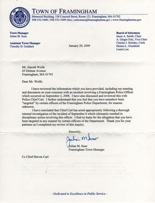 From: Harold J. Wolfe Reply-To: hjw2001@gmail.com To: Steven Carl Cc: town.manager@framinghamma.gov, Town.Counsel@framinghamma.gov, Selectmen@framinghamma.gov Subject: Police complaint from May 25, 2008 Date: Mon, 08 Sep 2008 04:48:31 -0400