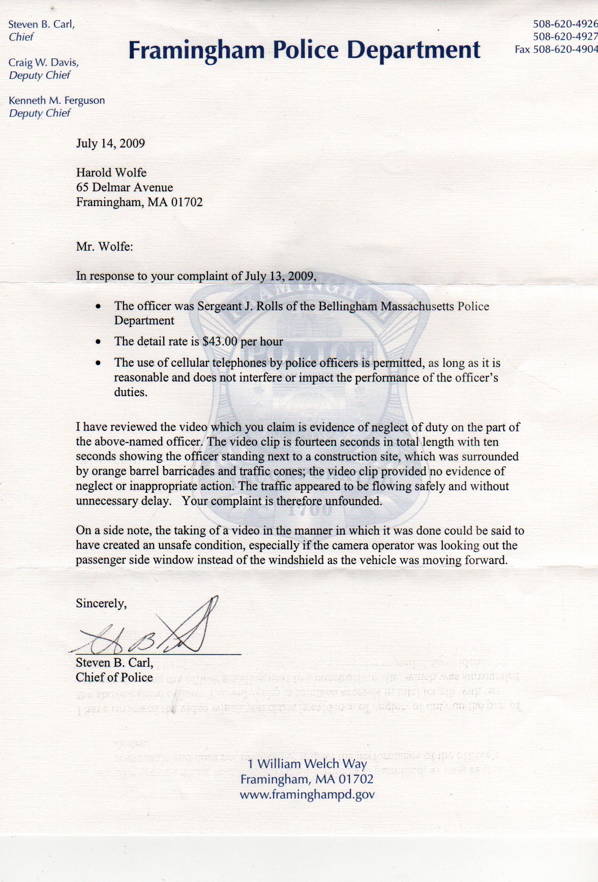 Police complaint, submitted 07/13/2009, officer taling on cellphone while on detail |