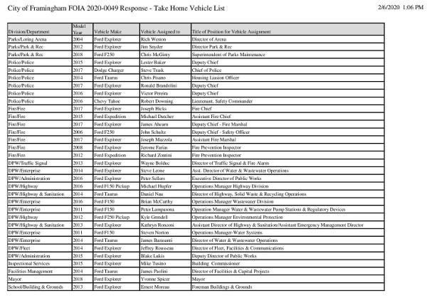 | Joseph Mazzola | Fire | Assistant fire marshal | 2008 Ford Explorer |